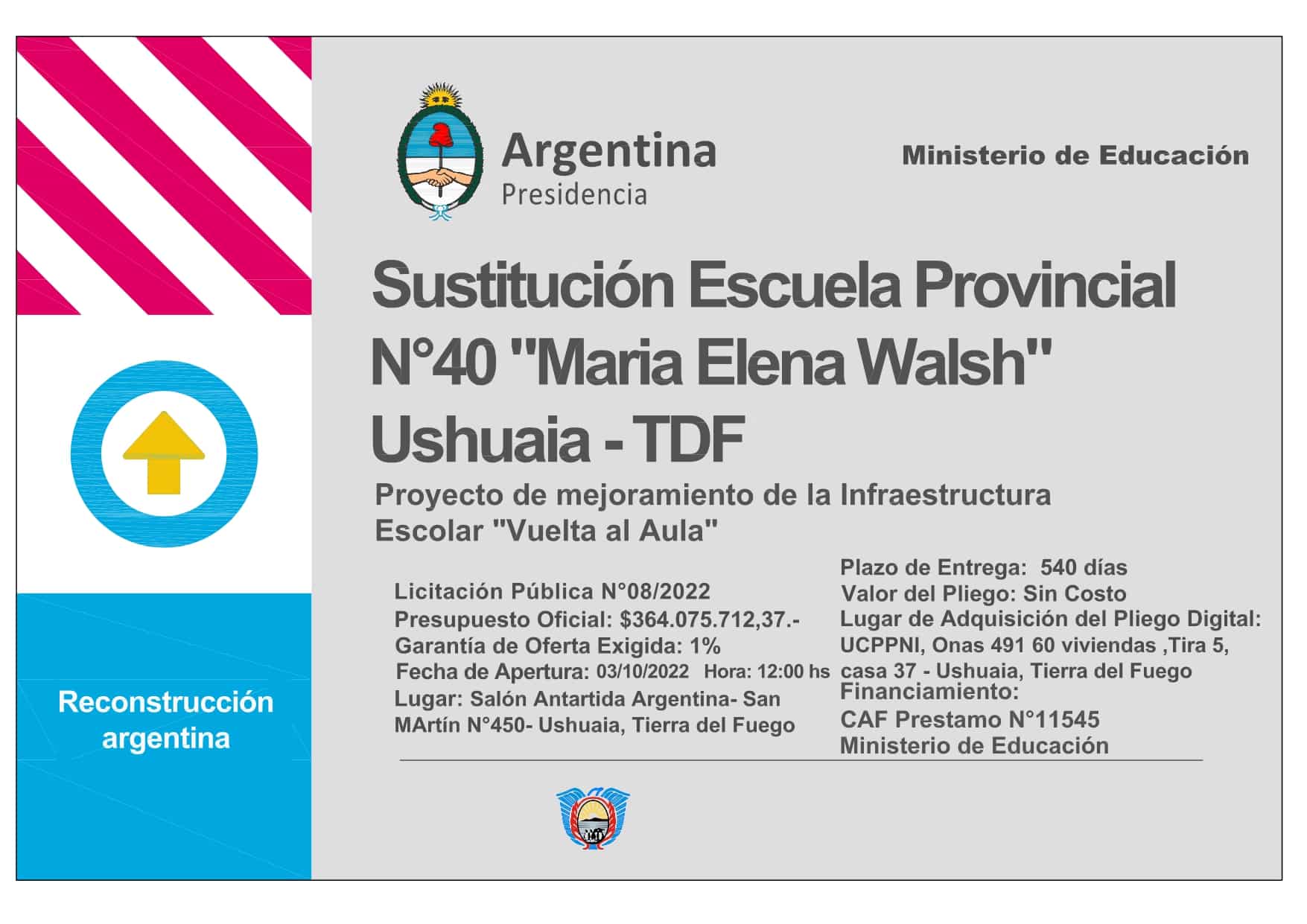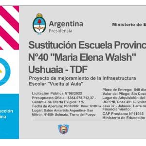LLAMADO A LICITACIÓN PÚBLICA NACIONAL N°08/2022 «SUSTITUCIÓN ESCUELA PROVINCIAL N°40 ‘MARÍA ELENA WALSH’ – USHUAIA»